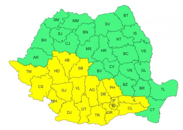 Avertizarea este valabilă de sâmbătă, ora 12, până la ora 23.