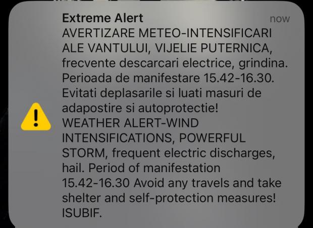 Codul portocaliu este valabil sâmbătă, 08.06.2024, de la ora 15:40 până ora 16:30.