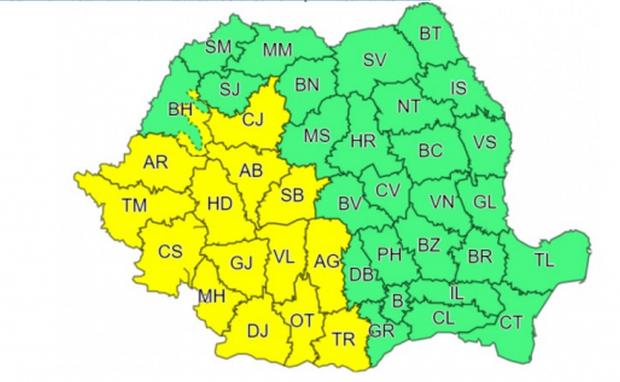 Avertizarea cod galben intră în vigoare astăzi, la ora 11:00 și este valabilă până miercuri, la ora 06:00.