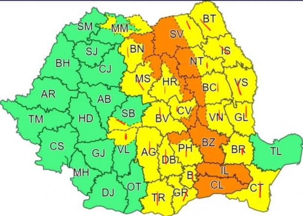 În zona Carpaților Orientali, în vestul Carpaților Meridionali și în județele Buzău, Ialomița și Călărași vor fi averse torențiale, descărcări electrice, intensificări de scurtă durată ale vântului și pe arii restrânse vijelii și grindină.