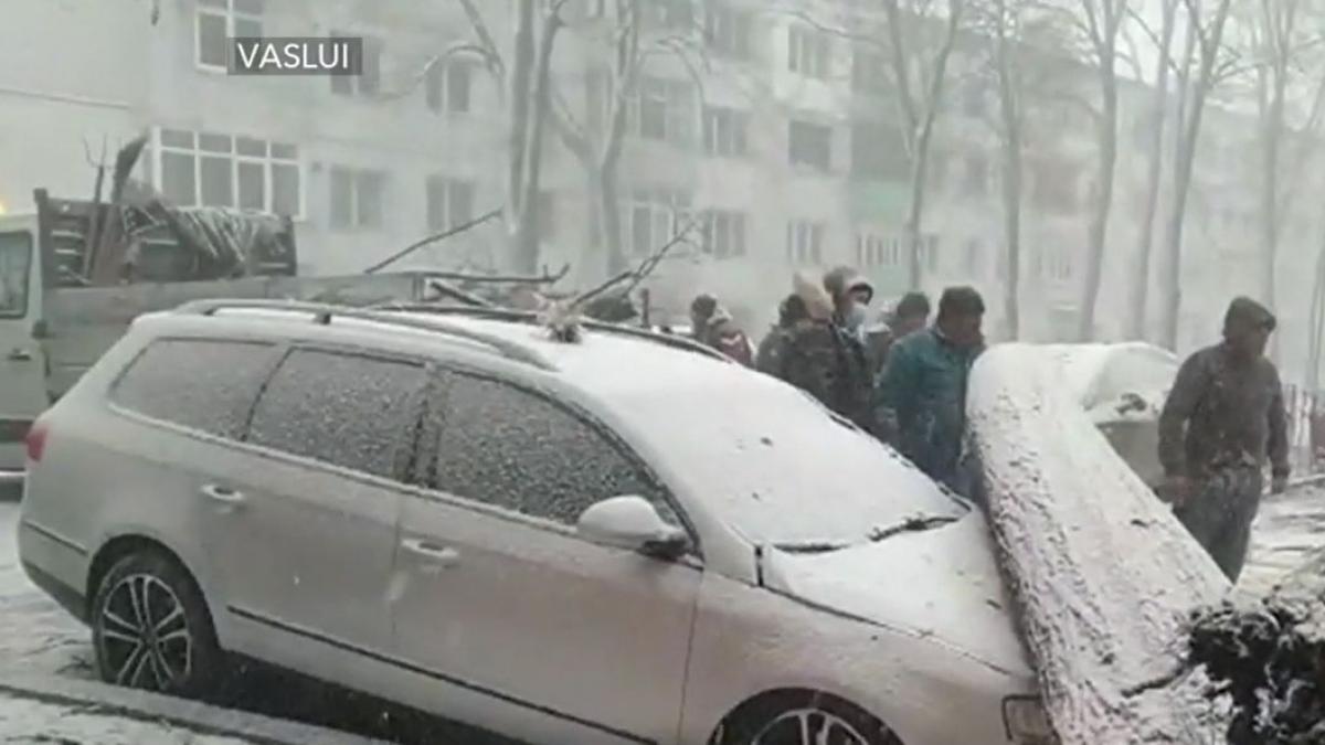 În Vaslui, vântul a pus la pământ mai mulţi copaci, iar două maşini au fost distruse în totalitate.