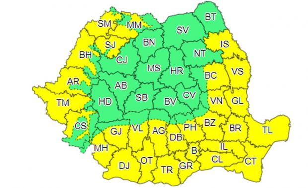 Astfel, până diseară, la ora 21:00, vor fi perioade cu instabilitate atmosferică accentuată local în zonele montane, Transilvania, Maramureș, Crișana, Banat, Oltenia și vestul Munteniei. Vor fi averse torențiale, descărcări electrice, intensificări ale vântului și pe alocuri vijelii și grindină. În intervale scurte de timp sau prin acumulare cantitățile de apă vor depăși 25...30 l/mp și pe arii restrânse 40...50 l/mp.