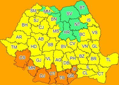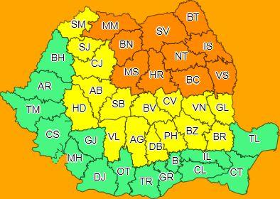 Totodată, județele Maramureș, Bistrița Năsăud, Mureș, Harghita, Suceava, Neamț, Bacău, Botoșani, Iași și Vaslui se vor afla, miercuri între orele 13.00 – 23.00, sub avertizare Cod portocaliu de vijelii.