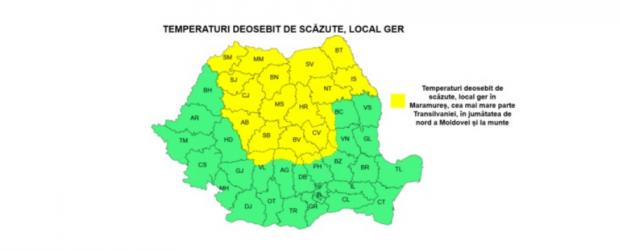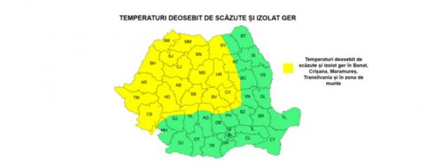 În Banat, Crișana, Maramureș, Transilvania, precum și în zona de munte se vor înregistra temperaturi deosebit de scăzute, în general de -8...-6 grade și izolat ger cu temperaturi în jurul a -10 grade.