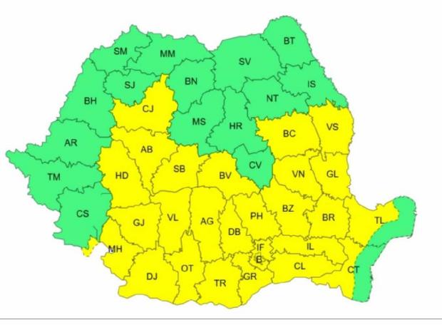 Meteorologii au emis și un cod galben valabil luni în 26 de județe dindin sudul, est și parțial centrul țării, începând cu ora 12.00 până miercuri la ora 03.00.