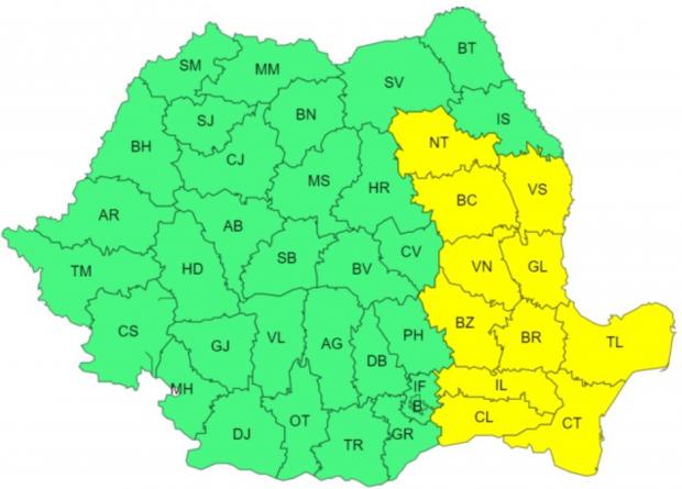 În intervalul menționat, în județele Neamț, Bacău, Vaslui, Galați, Vrancea, Tulcea și Constanța vor fi perioade cu averse. În intervale scurte de timp sau prin acumulare cantitățile de apă vor fi de 15...20 l/mp și izolat de peste 25 l/mp.