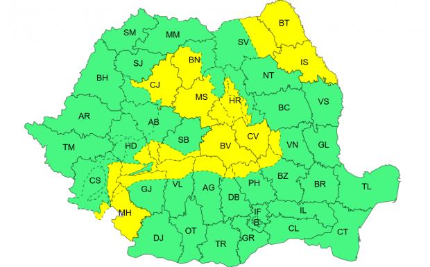 Pe parcursul zilei de vineri (24 aprilie), în nordul, estul și sud-estul Transilvaniei, nord-estul Moldovei și vestul Olteniei, vor fi intensificări ale vântului cu viteze de 50...65 km/h. În Carpații Meridionali și de Curbură, rafalele vor atinge 70...90 km/h.