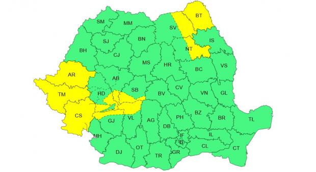 Pe parcursul zilei de duminică (14 septembrie), în județele Caraș-Severin, Timiș, Arad, Botoșani, zona joasă a județelor Suceava și Neamț, precum și în jumătatea de vest a Carpaților Meridionali, vântul va avea intensificări cu viteze de 50...70 km/h, iar la altitudini mari, în general de peste 1700 m, rafalele vor fi de 90...100 km/h. Codul este valabil între ora 8:00 şi 20:00.