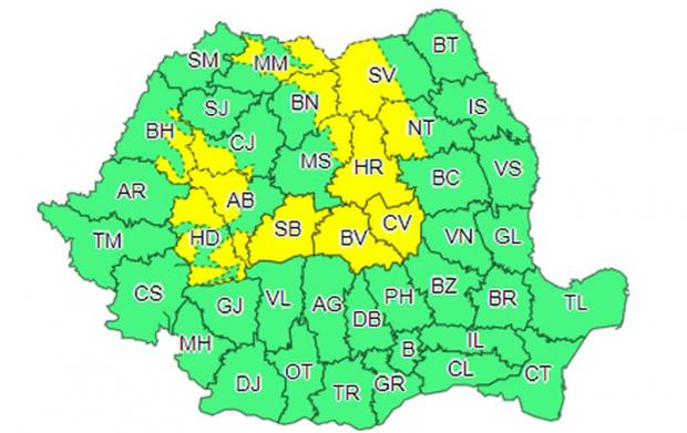 În intervalul menționat, local vor fi perioade cu instabilitate atmosferică accentuată ce se va manifesta prin frecvente descărcări electrice, averse torențiale, grindină și intensificări ale vântului, la munte și în sudul și estul Transilvaniei.