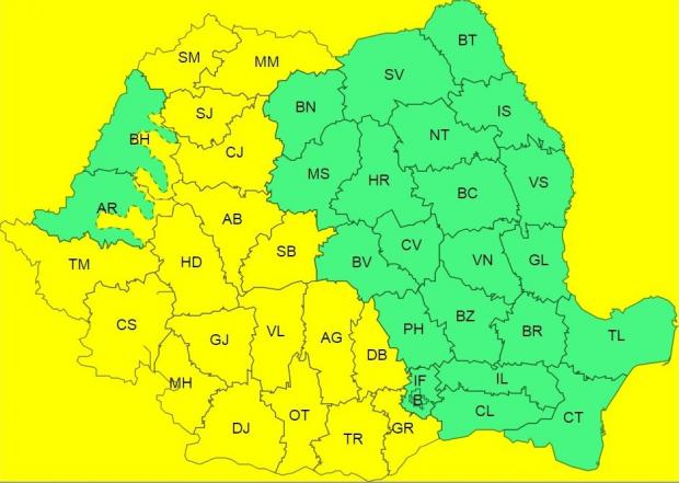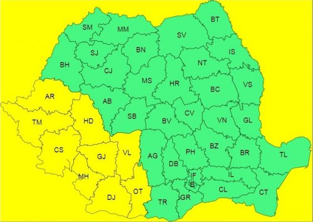 În Banat, Oltenia, Maramureș, vestul Transilvaniei și al Munteniei, precum și în zona Carpaților Occidentali, vor fi perioade cu instabilitate atmosferică accentuată care se va manifesta prin averse torențiale, descărcări electrice, intensificări ale vântului și izolat grindină.