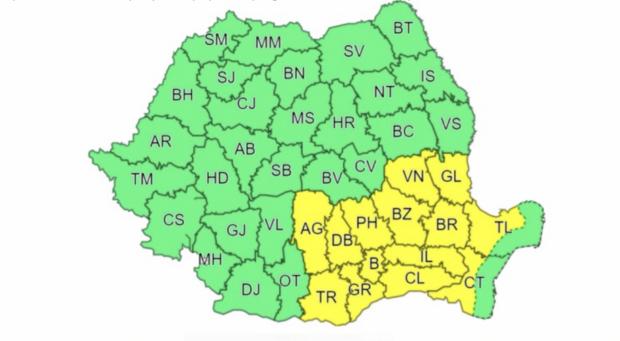 În Muntenia, sudul Moldovei și Dobrogea continentală vor fi perioade cu instabilitate atmosferică accentuată ce se va manifesta local prin intensificări ale vântului, vijelii (viteze la rafală de peste 60...70 km/h), descărcări electrice, averse ce vor avea și caracter torenţial și izolat grindină.