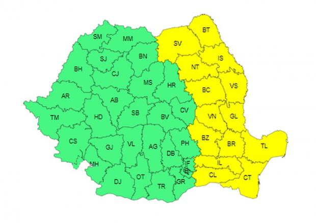 ANM a emis o avertizare Cod galben pentru intensificări ale vântului, polei, ninsori moderate cantitativ și viscol în Moldova, Dobrogea și jumătatea de est a Munteniei.