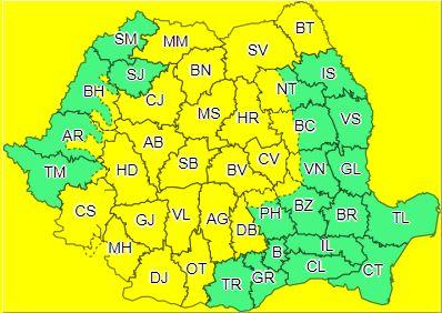 În intervalul menţionat, vor fi averse, descãrcãri electrice, intensificãri ale vântului, vijelii şi izolat grindinã în Oltenia, sudul Banatului, nord-vestul Munteniei, Maramureş, Transilvania, la munte şi local în Moldova. Ploile vor avea şi caracter torenţial, iar cantitãţile de apã vor depãşi, în intervale scurte de timp sau prin acumulare, 25...55 l/mp, îndeosebi în zonele de deal şi de munte.