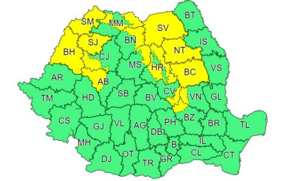 A doua avertizare cod galben este valabilă de astăzi, ora 18:00, până duminică, ora 18:00.