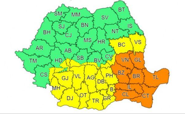 În intervalul menționat în județele Vrancea, Galați, Buzău, Brăila, Ialomița, Călărași, Tulcea și Constanța va ninge și va fi viscol.