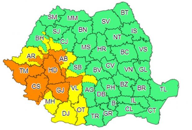 În intervalul menționat, în județele Caraș-Severin, Hunedoara, Timiș, Gorj, precum și Carpații Occidentali și vestul Carpaților Meridionali, vor fi averse torențiale. Local cantitățile de apă vor fi de 40...50 l/mp (în intervale scurte de timp, de până la 1 – 3 ore).