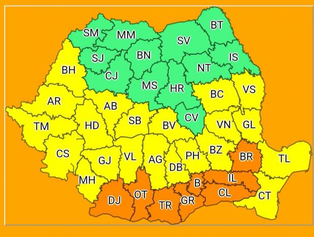 Codul portocaliu de caniculă şi disconfort termic accentuat este valabil pentru judeţele Dolj, Olt, Teleorman, Giurgiu, Călăraşi, Ialomiţa, Brăila, Ilfov şi municipiul Bucureşti, unde vor fi maxime de 39 de grade până joi la ora 10.