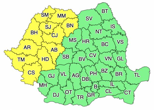 Seara și la începutul nopții în Banat, Crișana și Maramureș, apoi în vestul și nordul Transilvaniei vor fi perioade cu instabilitate atmosferică accentuată, ce se va manifesta prin intensificări ale vântului (viteze în general de 55...75 km/h), vijelii, descărcări electrice, local averse ce vor avea și caracter torențial. Izolat va fi grindină, iar cantitățile de apă vor depăși 20...25 l/mp.