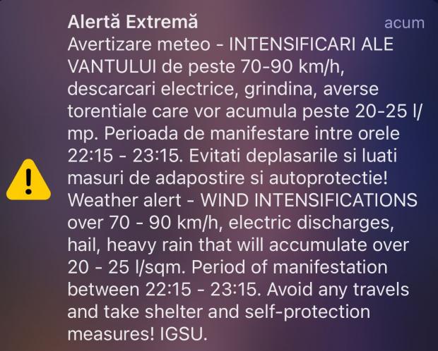 Se vor semnala vijelie puternică, cu rafale de 70…90 km/h, frecvente descărcări electrice, grindină de dimensiuni medii, local averse torențiale care vor acumula 20...25 l/mp.