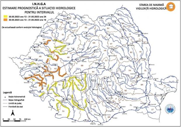 Astfel, de marți ora 13:00 până miercuri ora 24:00 este Cod galben pe râuri din județele Caraș-Severin şi Timiş, iar începând de marți ora 13:00 până miercuri la ora 9:00 pe râuri din judeţele Bihor, Cluj, Arad, Hunedoara, Alba, Timiş, Caraş Severin, Gorj, Mehedinţi, Dolj, Sibiu, Vâlcea, Argeş și Olt.