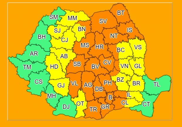Avertizarea meteo Cod portocaliu intră în vigoare, astăzi, la ora 12:00, și este valabilă până joi, ora 12:00.