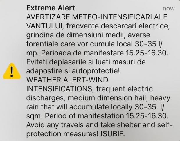 În urmă cu scurt timp a fost transmis un mesaj de avertizare prin sistemul Ro-Alert.