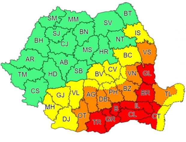 În județele Teleorman, Giurgiu, Ilfov, Călărași, Ialomița, Brăila, Galați, vestul județului Constanța și în municipiul București, se vor înregistra temperaturi maxime extreme în general de 40...41 de grade, iar disconfortul termic va fi deosebit de accentuat.