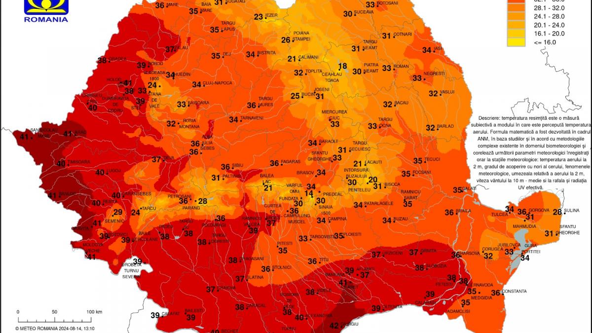 Vineri (16 august), în nordul Crișanei, cea mai mare parte a Transilvaniei și a Munteniei și în nordul Olteniei va fi caniculă și disconfort termic ridicat, iar indicele temperatură-umezeală (ITU) va depăși pragul critic de 80 de unități. Temperaturile maxime vor fi de 35...37 de grade. Local minimele nu vor coborî sub 20 de grade și vor caracteriza o noapte tropicală.