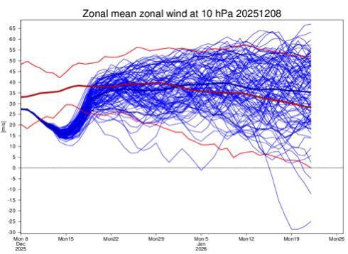 "O perspectivă a evoluției vortexului polar stratosferic pe o perioadă de timp mai lungă, între 10 decembrie 2025 – 22 ianuarie 2026, este dată de mai multe modele numerice de prognoză a vremii. Niciunul nu este perfect, fiecare dintre ele a avut estimări mai mult sau mai puțin reușite, pentru diverse intervale de timp, dar, unul dintre cele mai bune, în cele mai multe cazuri, este European Center for Medium Weather Forecast (ECMWF) (fig. 1).