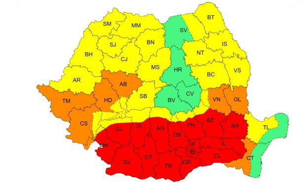În același interval este Cod portocaliu în Banat, sud-vestul Transilvaniei, sudul Moldovei și al Dobrogei continentale, unde valul de căldură se va menține, va fi caniculă, disconfort termic accentuat, iar indicele temperatură-umezeală va depăși pragul critic de 80 de unități. Temperaturile maxime se vor încadra între 36 și 39 de grade, iar minimele nu vor coborî sub 20 de grade, caracterizând o noapte tropicală.