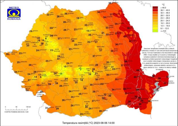 Dacă la Oradea, spre exemplu, temperatura resimţită este de 19 grade, la Cernavodă sunt 41 de grade Celsius.