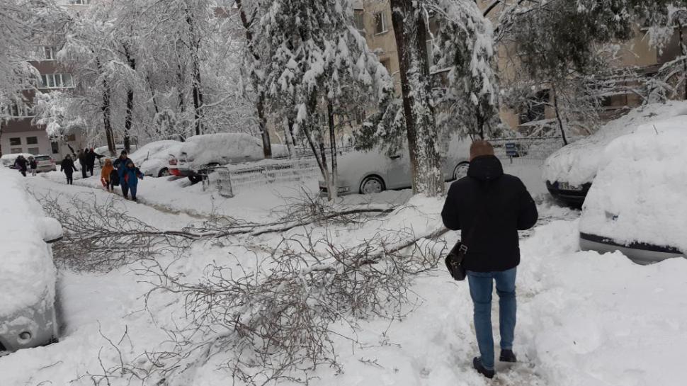 Zeci de copaci au fost puşi la pământ de vântul puternic şi mai multe maşini au fost avariate sau au rămas împotmolite în zapadă.