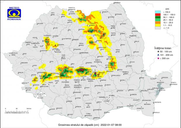 Grosimea stratului de zăpadă în România, 7 ianuarie 2022, a fost publicată, astăzi, de Administraţia Naţională de Meteorologie.