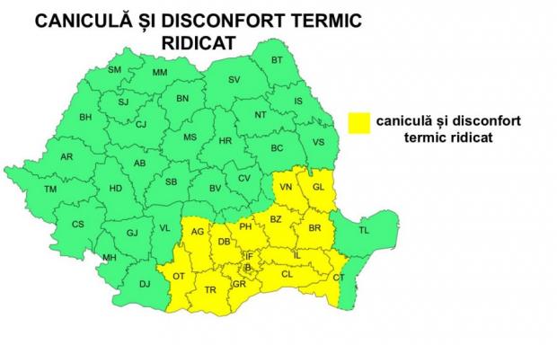 Luni, în sud-estul Olteniei, Muntenia, sudul Moldovei, precum și în sud-vestul Dobrogei va fi caniculă și disconfort termic ridicat, iar indicele temperatură-umezeală (ITU) va atinge pragul critic de 80 de unități. Temperaturile maxime vor fi de 35...37 de grade.