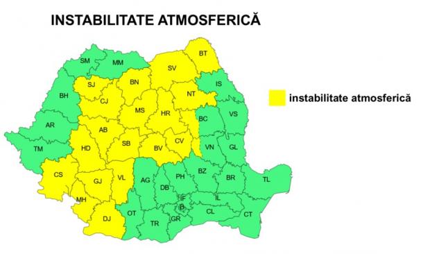 În Transilvania, nordul și nord-vestul Moldovei, cea mai mare parte a Olteniei, sudul Banatului și local la munte vor fi perioade cu instabilitate atmosferică ce se va manifesta prin averse torențiale, descărcări electrice, intensificări ale vântului, vijelii (rafale de 50...70 km/h) și izolat grindină. În intervale scurte de timp sau prin acumulare, cantitățile de apă vor fi de 20...30 l/mp și izolat de peste 40 l/mp.