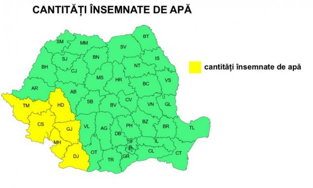 În Banat, jumătatea vestică a Olteniei și în sud-vestul Transilvaniei va ploua însemnat cantitativ. Prin acumulare cantitățile de apă vor fi de 20...25 l/mp și pe arii restrânse de peste 40 l/mp.