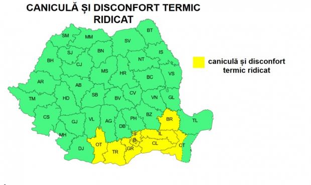 Marți, în sud-estul Olteniei, în sudul și în estul Munteniei, precum și în sud-vestul Dobrogei va fi caniculă și disconfort termic ridicat, iar indicele temperatură-umezeală (ITU) va atinge sau va depăși ușor pragul critic de 80 de unități. Temperaturile maxime vor fi de 35...37 de grade.