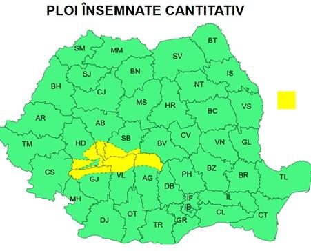 Vor fi precipitații în cea mai mare parte a țării și se vor acumula cantități de apă local de 10...15 l/mp, iar îndeosebi în nordul Olteniei și în nord-vestul Munteniei, precum și în vestul Carpaților Meridionali de 20...30 l/mp, și izolat de peste 60 l/mp.