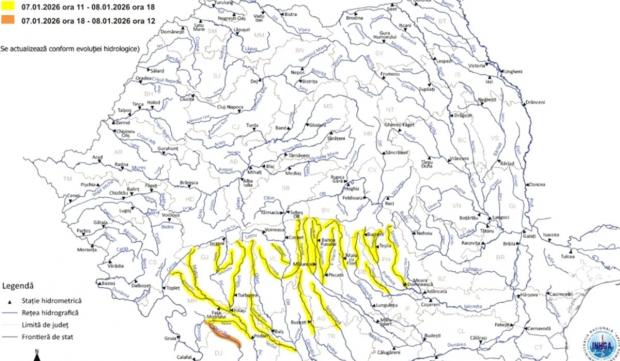 Hidrologii au emis, miercuri, o avertizare Cod portocaliu de inundații pentru râuri din județele Mehedinți și Dolj, valabilă în intervalul 7 ianuarie, ora 18:00 – 8 ianuarie, ora 12:00. Alte 10 județe se află sub Cod galben de inundații.
