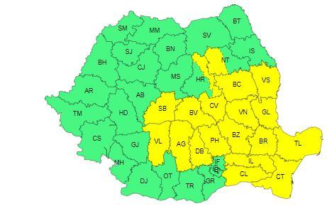 Conform prognozei de specialitate, joi, între orele 10:00 - 23:00, va fi Cod galben de instabilitate atmosferică şi cantităţi însemnate de apă în Dobrogea, jumătatea de sud a Moldovei, în sudul Transilvaniei, nordul şi estul Munteniei, nord-estul Olteniei, local în Carpaţii Orientali şi Meridionali. În aceste regiuni vor fi averse, descărcări electrice şi intensificări de scurtă durată ale vântului (cu viteze, în general, de 50 - 60 km/h) şi vijelii.