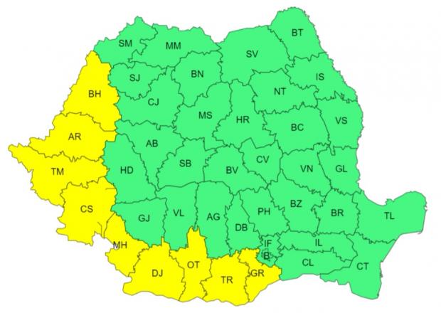 Pentru ziua de luni, 8 iulie, meteorologii au extins codul galben de canicula la mai multe regiuni. Astfel, temperaturilor vor ajunge la 35-37 de grade Celsius în Crișana, Banat, Oltenia, Muntenia, Dobrogea continentală și jumătatea de sud a Moldovei, unde va fi caniculă și disconfort termic ridicat.