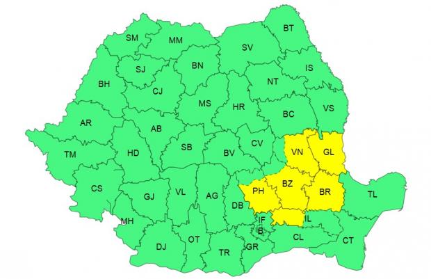 În județele Galați, Brăila, vestul județului Ialomița, zona joasă a județelor Vrancea, Buzău, Prahova, temporar vântul va avea intensificări, cu rafale de 50...70 km/h.