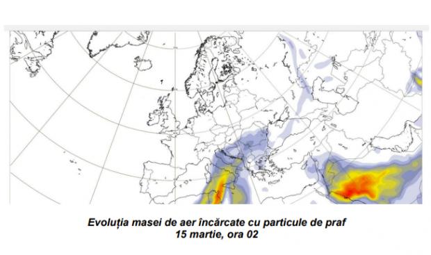 încărcate cu particule de praf de origine sahariană către sud-estul Europei și deasupra României. Depunerile de praf vor putea fi observate în intervalele în care va ploua.”, se arată în comunicatul ANM.
