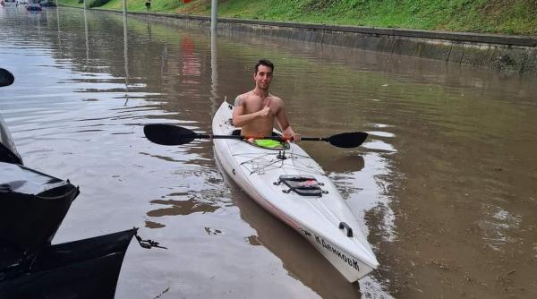 În oraşul vecin de peste Dunăre, Ruse, s-au produs inundaţii, miercuri după-amiază. Cu precădere a fost afectată zonă joasă din apropiere de Vama Giurgiu, unde câteva maşini au rămas blocate în apă. Pe bulevardul Marele Atanasov apa a fost atât de mare, încât un localnic a ieşit cu caiacul!