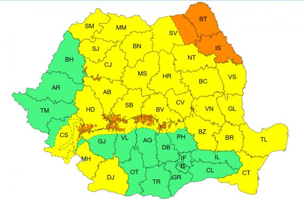Fenomene vizate: precipitații mixte la munte, în estul și sudul Transilvaniei, predominant ninsori la altitudini de peste 1400 m, intensificări ale vântului, vreme rece, brumă