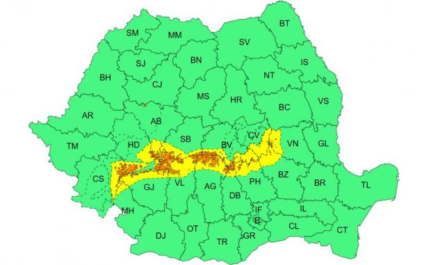 Zone avertizate: la altitudini în general de peste 1500 m în Carpații Meridionali și local în Carpații de Curbură