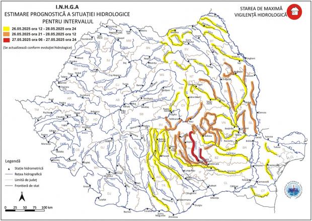 În intervalul 26.05.2025 ora 21:00 – 28.05.2025 ora 12:00 pe râurile din bazinele hidrografice: Râul Negru (judeţele: Covasna, Harghita şi Braşov), Olt – afluenţii de stânga aferenţi sectorului aval S.H. Podu Olt – amonte S.H. Sebeş Olt (judeţele: Braşov şi Sibiu), Ialomiţa – bazin amonte Ac. Pucioasa şi afluenţii aferenţi sectorului aval Ac. Pucioasa – amonte S.H. Siliştea Snagovului (judeţele: Dâmboviţa, Prahova şi Ilfov), Prahova (judeţele: Prahova şi Ialomiţa), Sărata – afluent al râului Ialomiţa (judeţele: Buzău, Prahova şi Ialomiţa), Buzău – bazin amonte S.H. Nehoiu şi afluenţii aferenţi sectorului aval S.H. Nehoiu – amonte S.H. Baniţa (judeţele: Braşov, Covasna, Buzău şi Prahova), Trotuş – afluenţii aferenţi sectorului aval S.H. Goioasa (judeţele: Bacău, Neamţ, Harghita şi Covasna), Bârlad – bazin amonte S.H. Negreşti şi afluenţii aferenţi sectorului aval S.H. Negreşti (judeţele: Neamţ, Vaslui, Iaşi, Bacău, Vrancea şi Galaţi), Putna – bazin superior şi afluenţi bazin mijlociu şi inferior (judeţul Vrancea), Râmnicu Sărat – bazin superior şi afluenţi bazin mijlociu şi inferior (judeţele: Vrancea şi Buzău), Siret – afluenţii mici aferenţi sectorului aval S.H. Drăgeşti (judeţele: Bacău, Vrancea şi Galaţi), Prut – afluenţii aferenţi sectorului aval S.H. Drânceni (judeţele: Vaslui şi Galaţi).