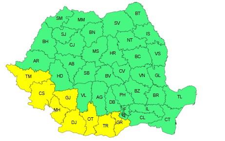 Codul galben este valabil de miercuri, 4 iunie, și vizează temperaturi deosebit de ridicate și disconfort termic ridicat în Banat, cea mai mare parte a Olteniei și în sud-vestul Munteniei. Aici se vor înregistra temperaturi deosebit de ridicate pentru această dată, va fi disconfort termic ridicat, iar indicele temperatură-umezeală (ITU) va depăși ușor pragul critic de 80 de unități.