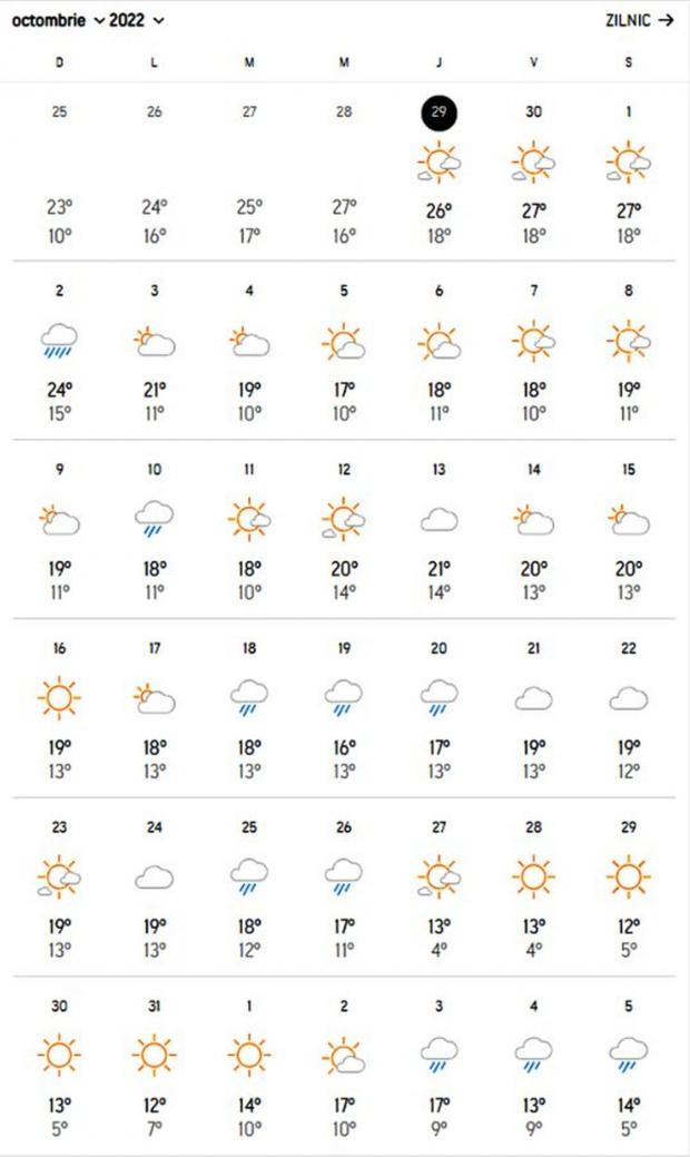 Dacă ultimele zile din septembrie aduc temperaturi de până la 34 de grade Celsius, începutul lui octombrie aduce vreme rece, cu temperaturi mai mici cu 10 grade, de la o zi la alta.