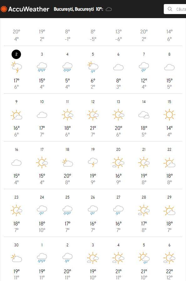 Iată, în prognoza meteo Accuweather pe aprilie 2023 cum va fi vremea inclusiv de Floriile ortodoxe şi de Paşte, în principalele oraşe din ţară.